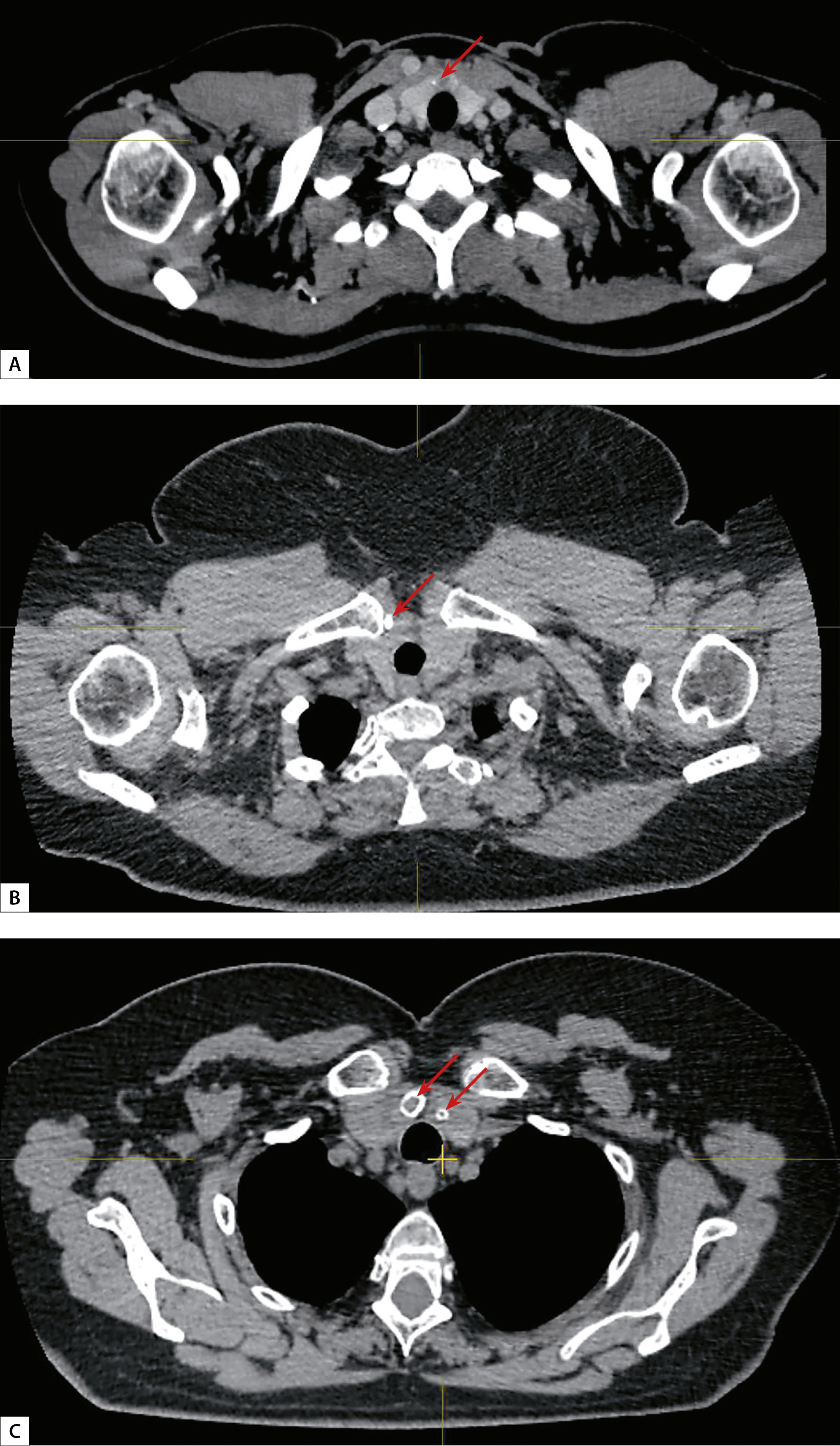 6. Рисунок 6. КТ-картина кальцинатов щитовидной железы (кальцинаты указаны стрелкой). А — микрокальцинат, В — макрокальцинат, С — периферическая кальцификация образований.