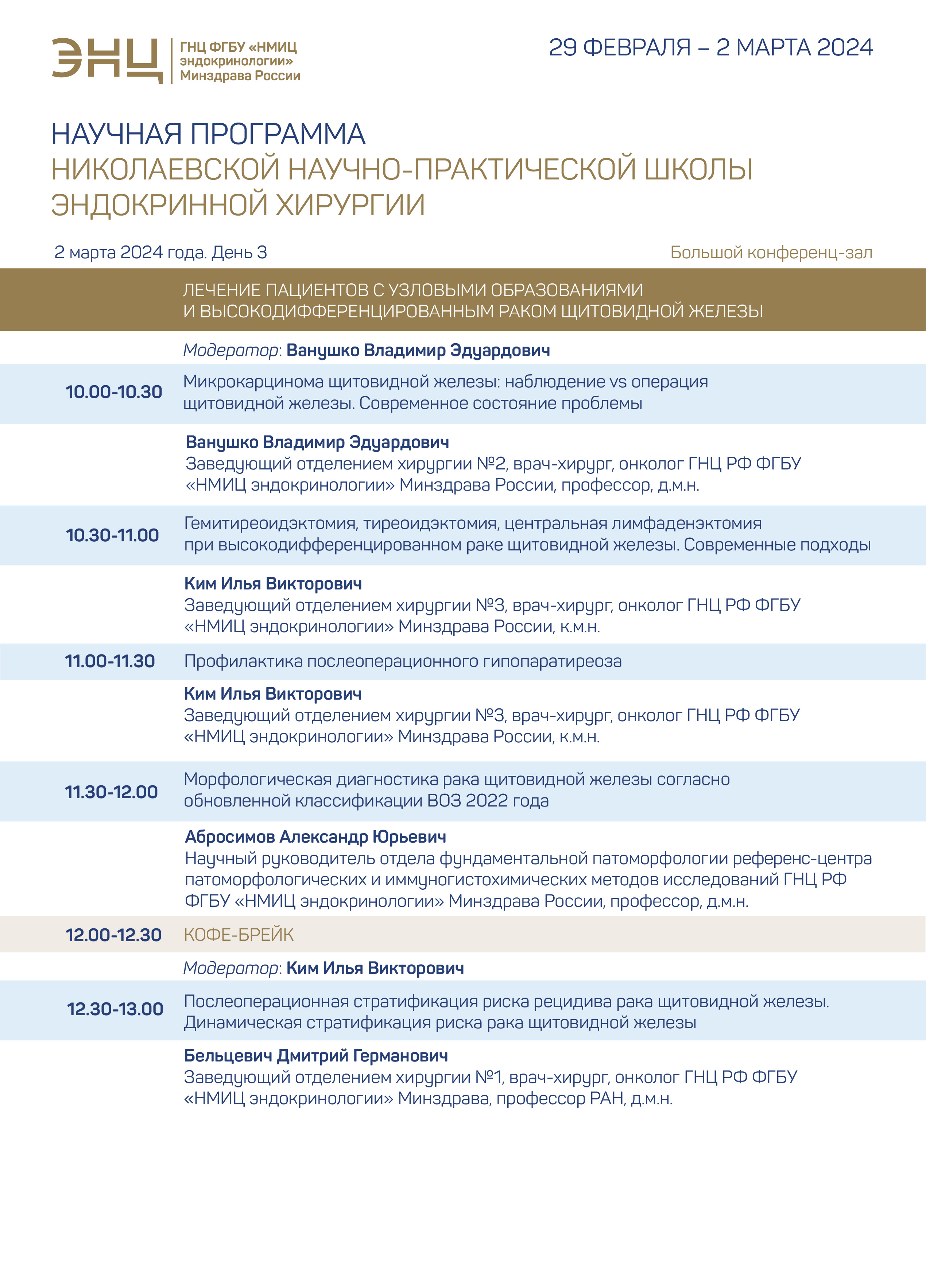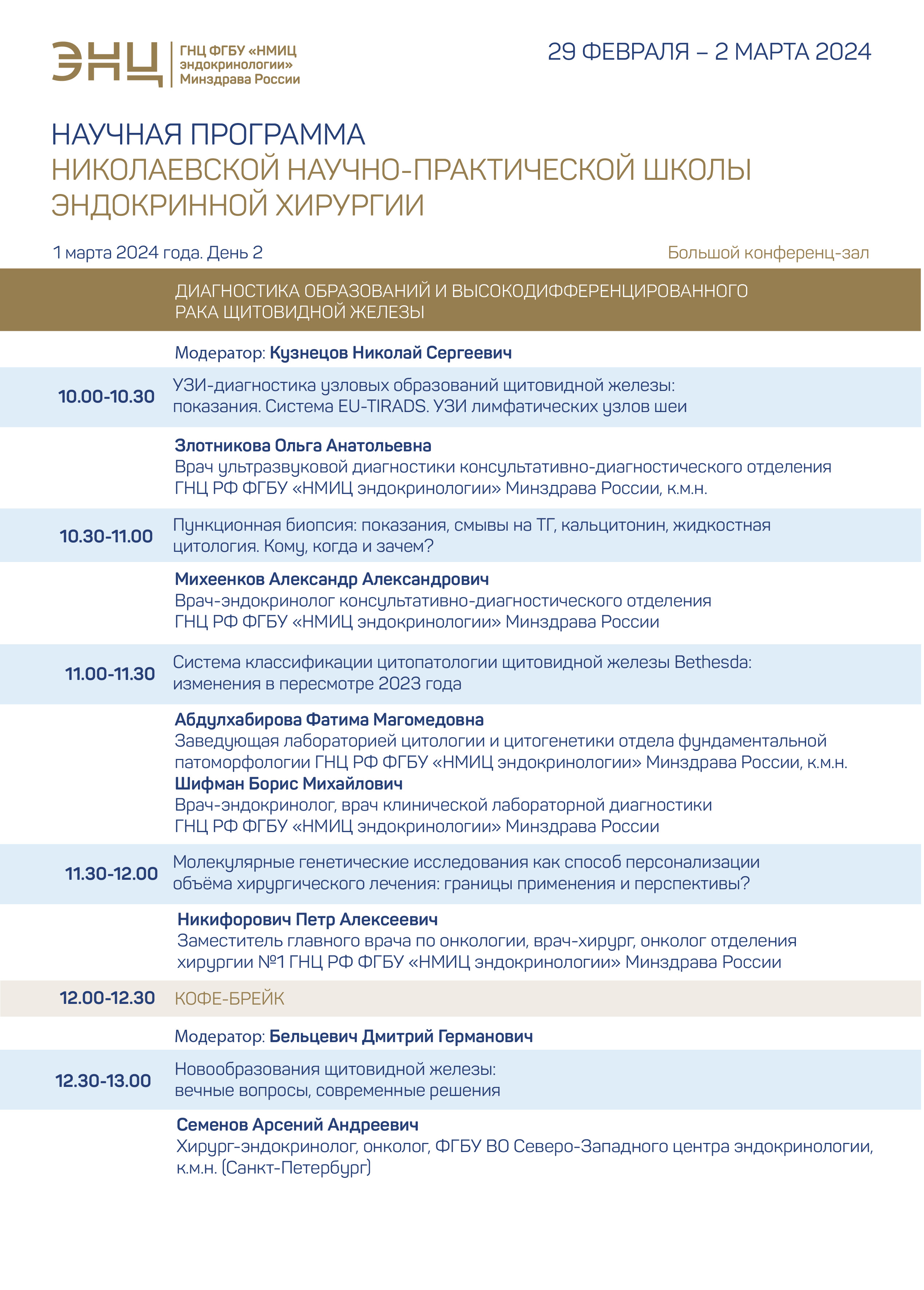 4. Научная программа Николаевской научно-практической школы эндокринной хирургии (29 февраля – 2 марта 2024). 1 марта 2024 года. День 2. 10.00-13.00.
