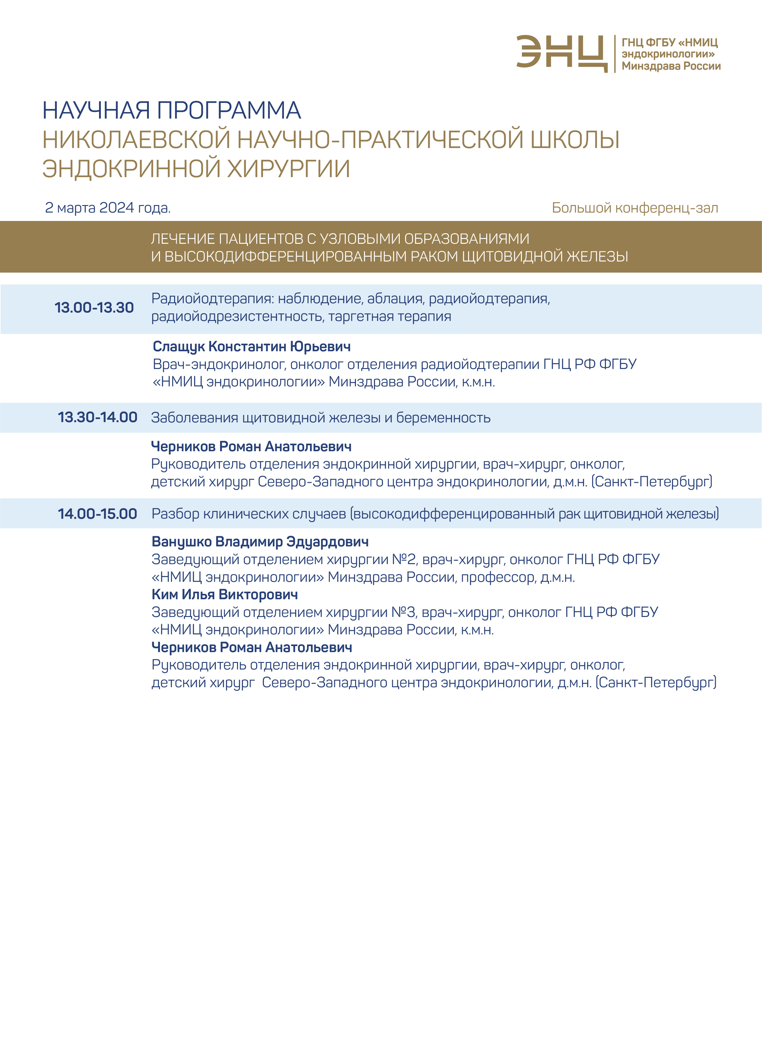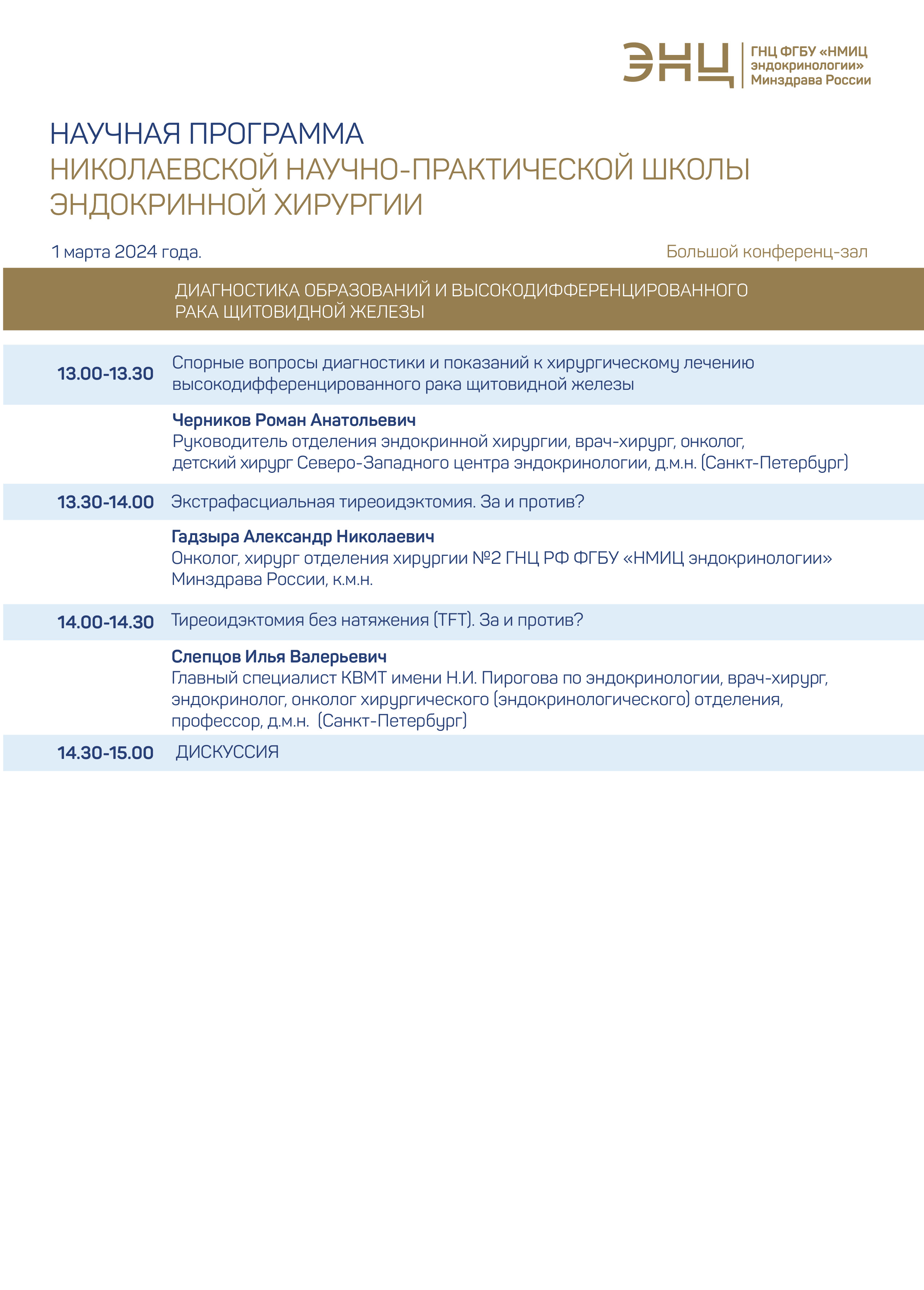 5. Научная программа Николаевской научно-практической школы эндокринной хирургии (29 февраля – 2 марта 2024). 1 марта 2024 года. День 2. 13.00-15.00.