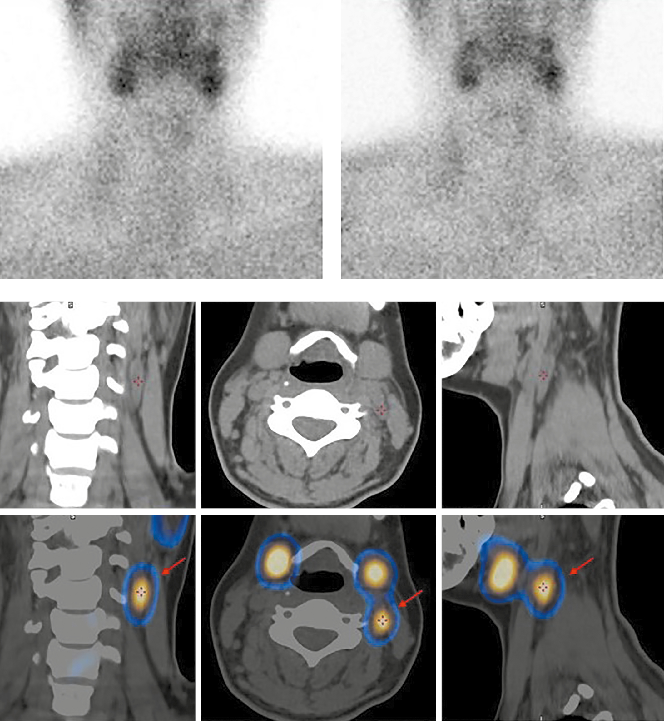 2. Рисунок 2. Верхний ряд — планарная сцинтиграфия через 15 и 90 минут после введения РФП. Нижний ряд — ОФЭКТ-КТ через 90 мин.