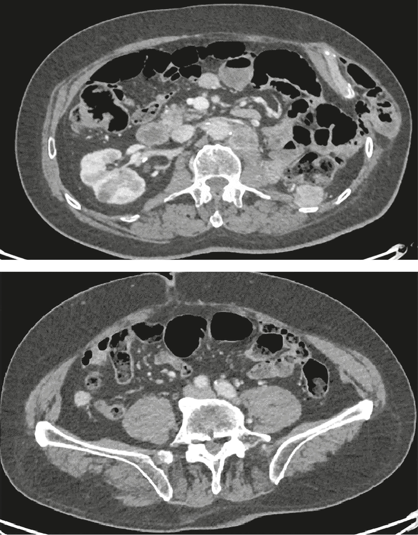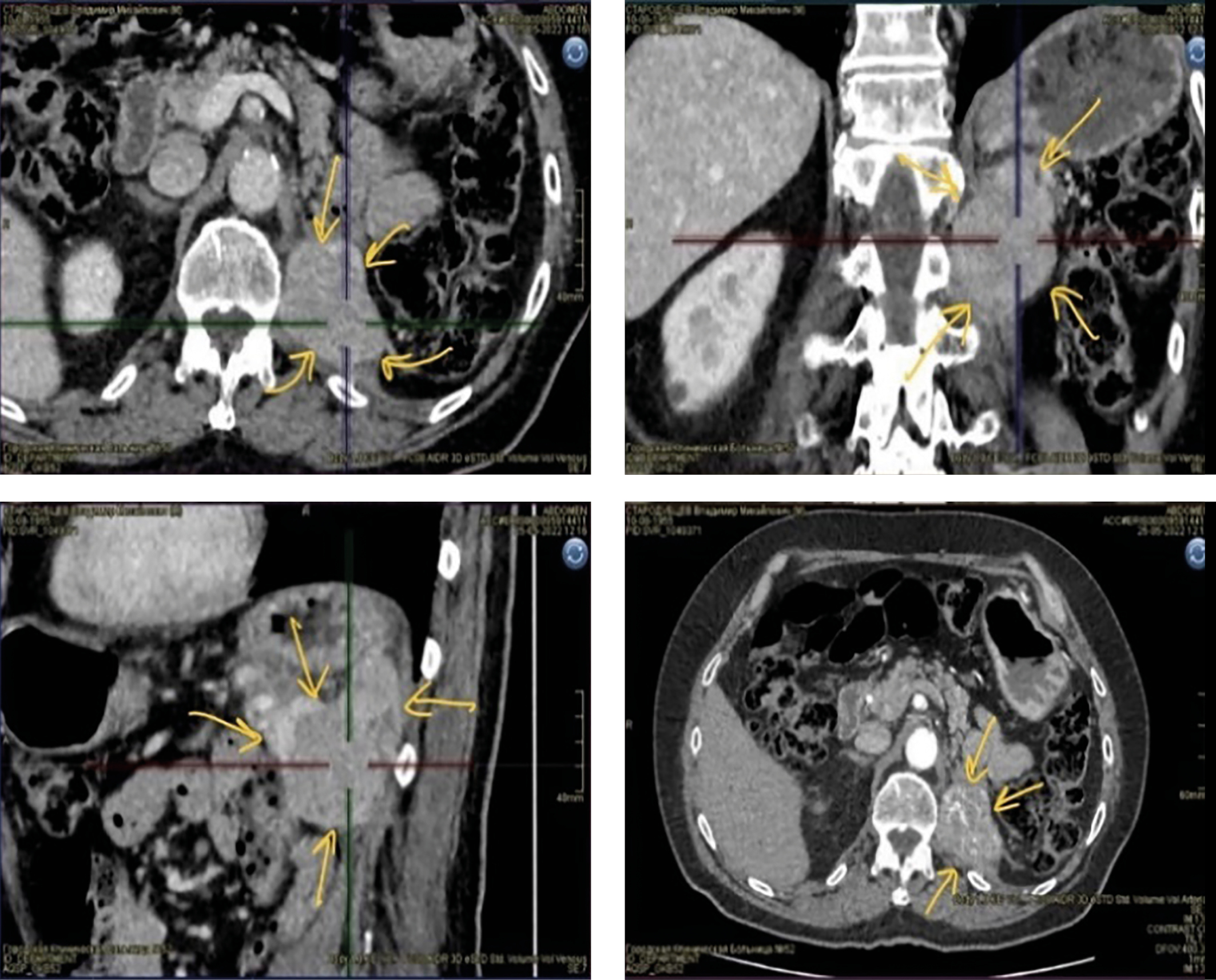 2. Рисунок 2. МСКТ органов брюшной полости пациента, июнь 2022 г. (стрелками обозначено гиперваскулярное объемное образование забрюшинно слева на уровне L1).