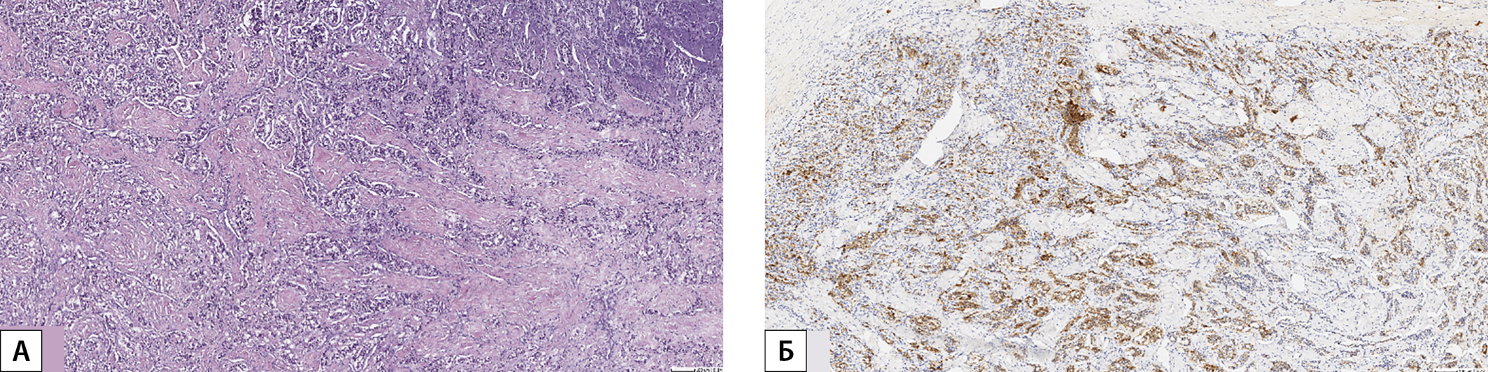 4. Рисунок 4. Морфологическое (рисунок А, клетки с амфифильной цитоплазмой, гиперхромными ядрами, умеренно выраженной клеточной и ядерной атипией) и иммуногистохимическое (рисунок Б, позитивная реакция с хромогранином А) исследования операционного материала.