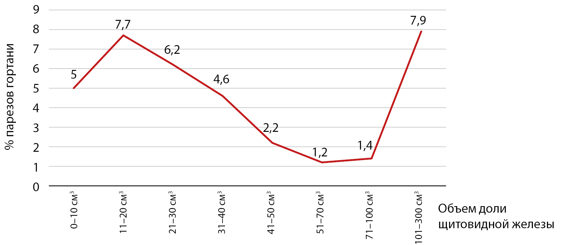 1. Диаграмма 1. Уровень послеоперационных парезов гортани в зависимости от объема удаляемой доли щитовидной железы. | |