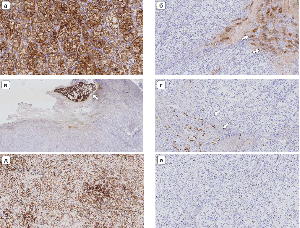 3. Рис.3. Результаты гистологического исследования удаленной опухоли: а – клетки опухоли экспрессируют СD10 (×200); б – экспрессия тиреоглобулина клетками предсуществующей щитовидной железы (х100); в – экспрессия паратгормона клетками прилежащей околощитовидной железы, отсутствие экспрессии опухолевыми клетками (×100); г – экспрессия TTF1 клетками предсуществующей щитовидной железы, отсутствие экспрессии опухолевыми клетками (×100); д – клетки опухоли экспрессируют панцитокератин (×200); е – индекс пролиферативной активности в опухолевых клетках. | |