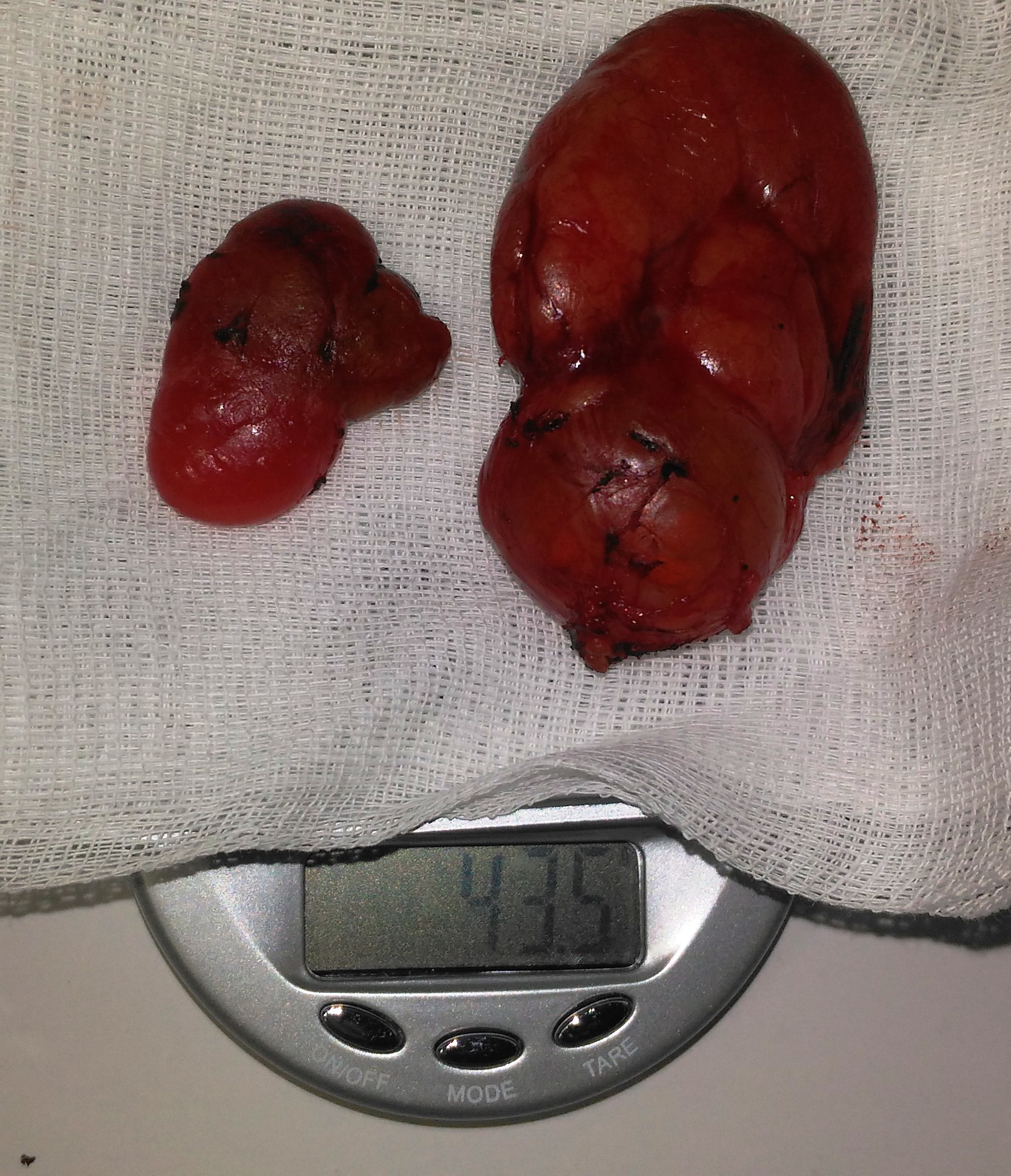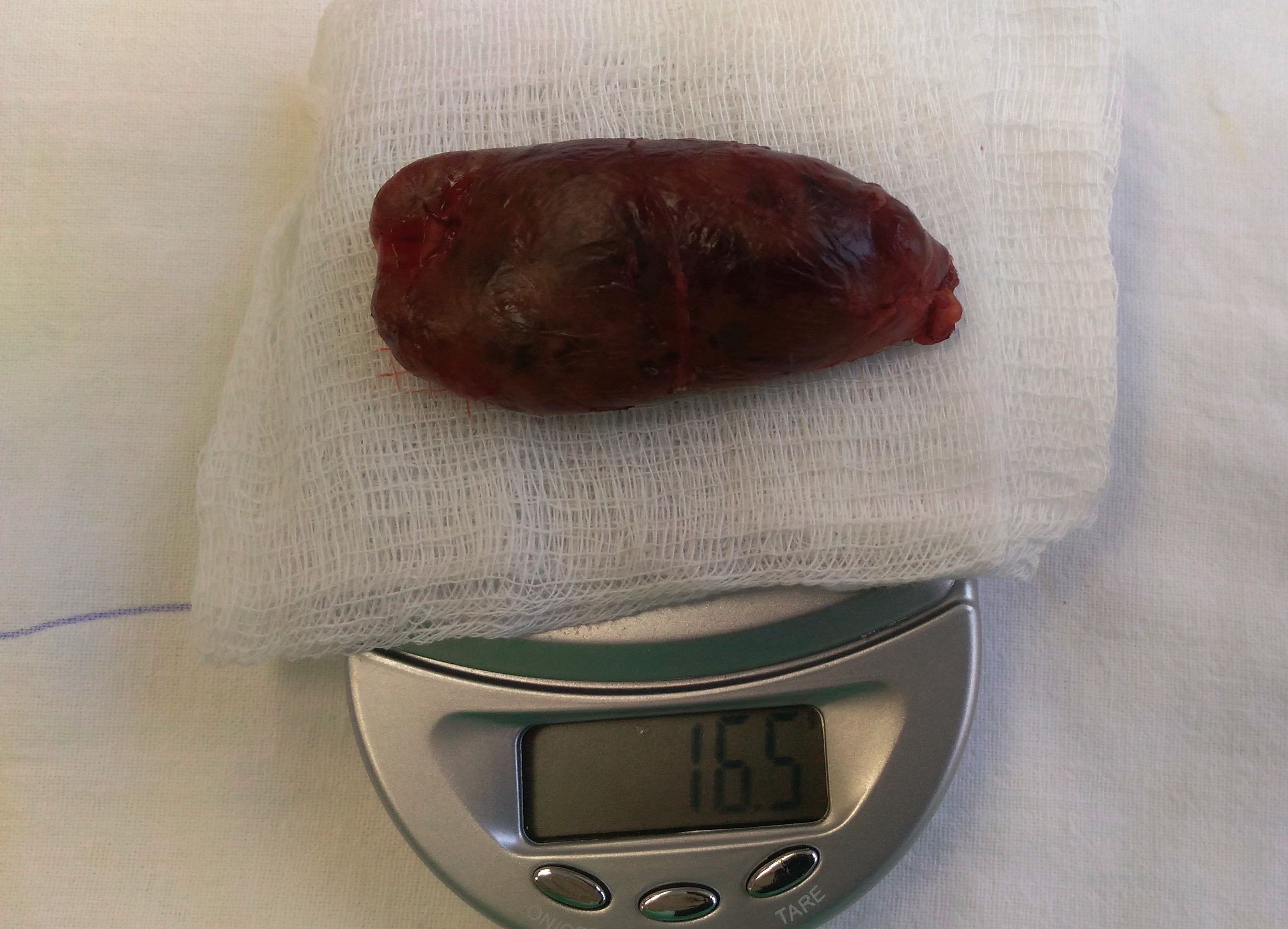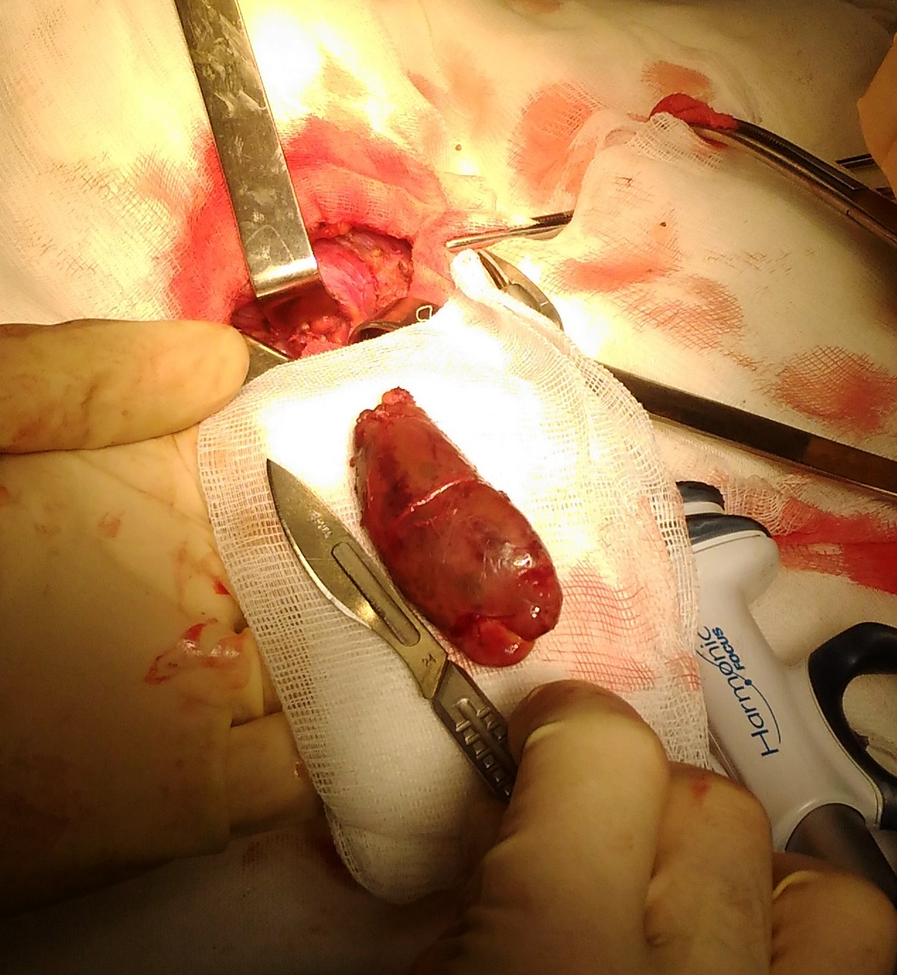 В плановом порядке 06.03.2017 пациентка была взята на операцию с клиническим диагнозом: “Первичный гиперпаратиреоз, висцеральная форма. Аденома околощитовидной железы справа. Узловой эутиреоидный зоб I ст. (ВОЗ)”. Во время операции при ревизии в области нижней трети правой доли ЩЖ обнаружена резко увеличенная аденома ОЩЖ, которая практически полностью, за исключением верхнего полюса, располагалась загрудинно. Размеры аденомы – 5,8 × 3,5 × 1,5 см, вес – 16,5 г (рис. 1). Аденома выделена и удалена под визуальным контролем возвратного нерва. Кроме того, была выполнена резекция верхнего полюса (1/3) ЩЖ слева с узлом. При патогистологическом исследовании – онкоцитарная аденома ОЩЖ; среднефолликулярный нормотоксический зоб с аутоиммунным компонентом.