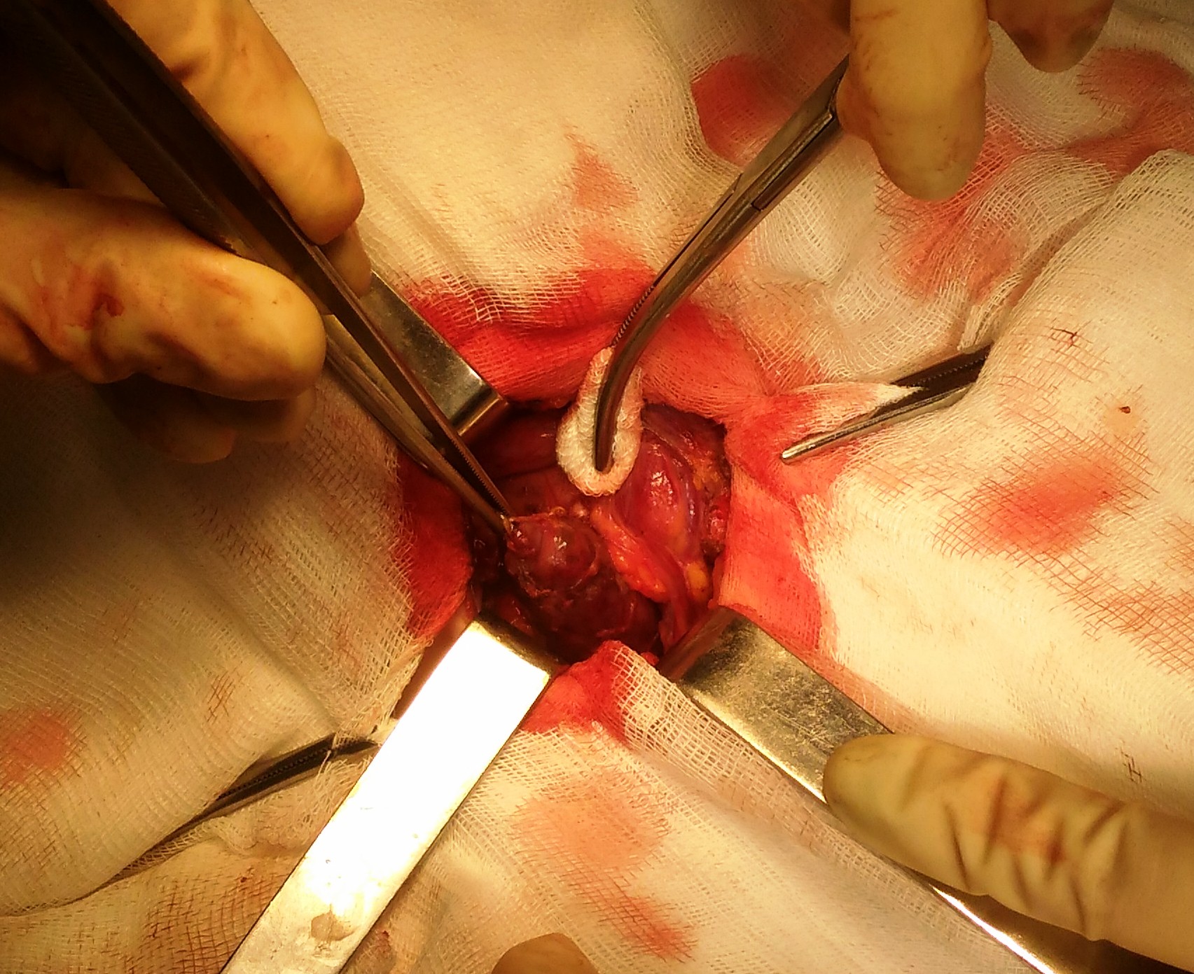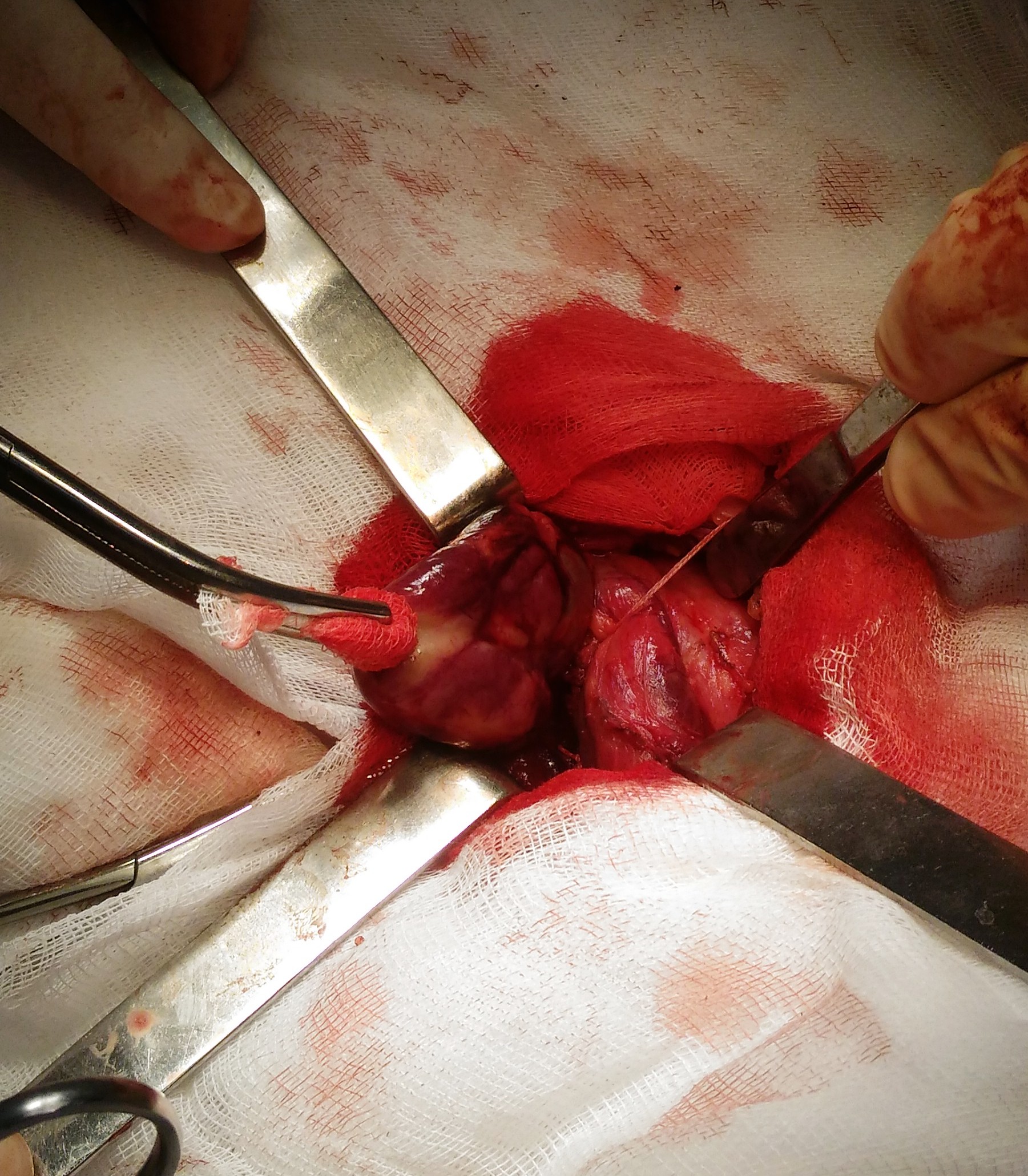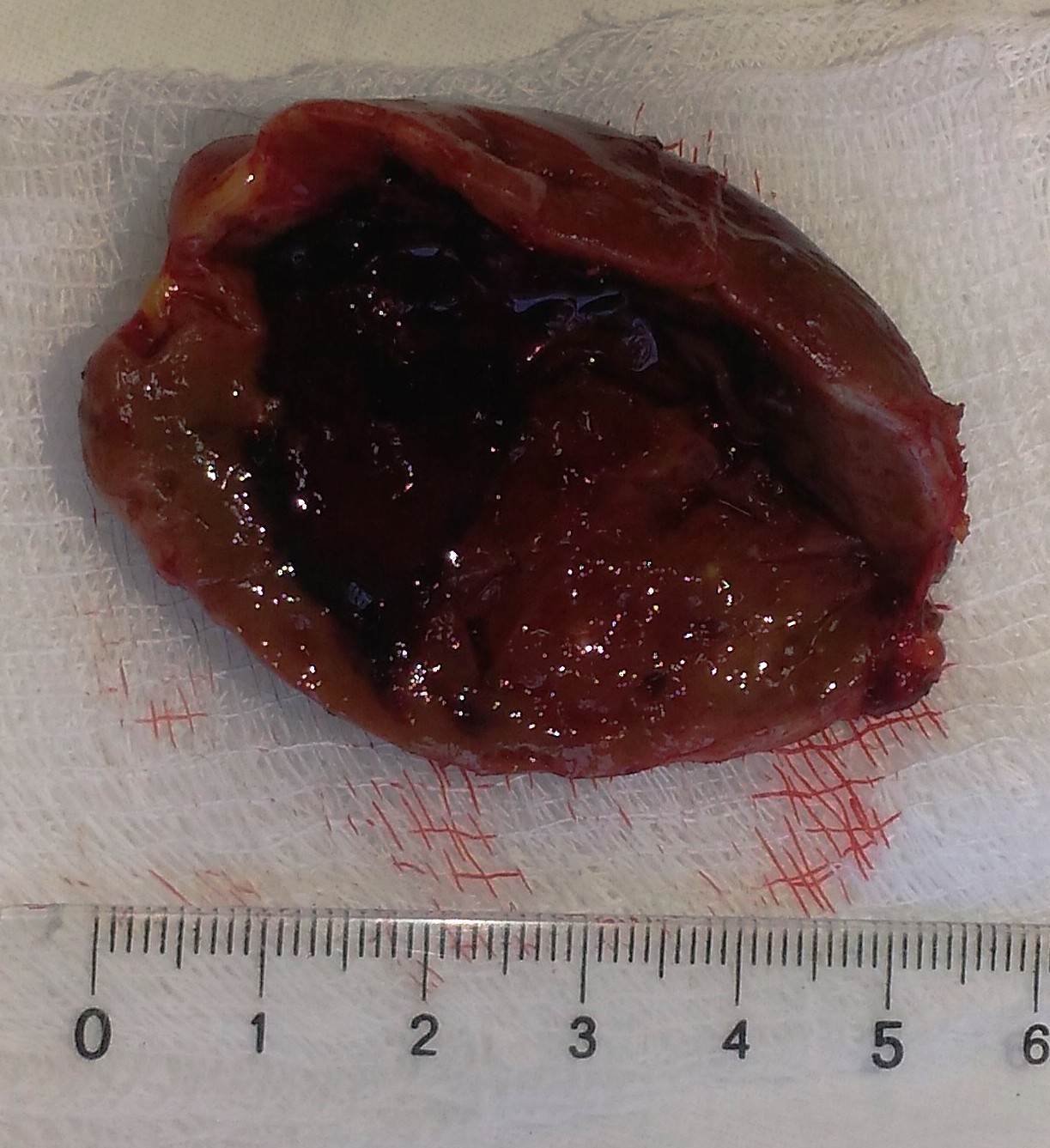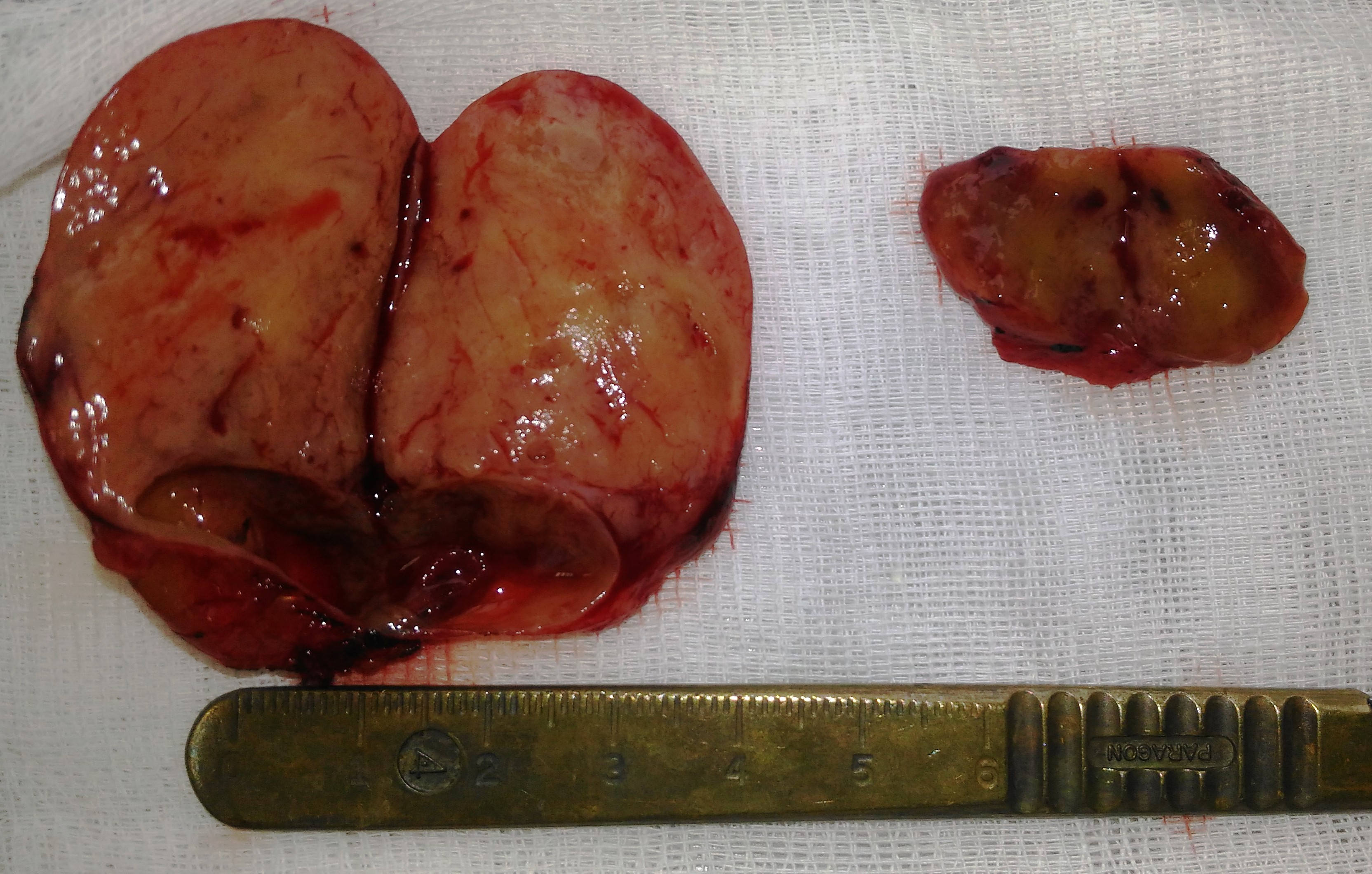 В плановом порядке 06.03.2017 пациентка была взята на операцию с клиническим диагнозом: “Первичный гиперпаратиреоз, висцеральная форма. Аденома околощитовидной железы справа. Узловой эутиреоидный зоб I ст. (ВОЗ)”. Во время операции при ревизии в области нижней трети правой доли ЩЖ обнаружена резко увеличенная аденома ОЩЖ, которая практически полностью, за исключением верхнего полюса, располагалась загрудинно. Размеры аденомы – 5,8 × 3,5 × 1,5 см, вес – 16,5 г (рис. 1). Аденома выделена и удалена под визуальным контролем возвратного нерва. Кроме того, была выполнена резекция верхнего полюса (1/3) ЩЖ слева с узлом. При патогистологическом исследовании – онкоцитарная аденома ОЩЖ; среднефолликулярный нормотоксический зоб с аутоиммунным компонентом.