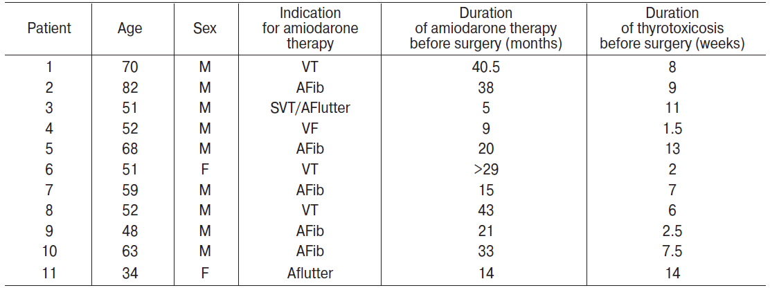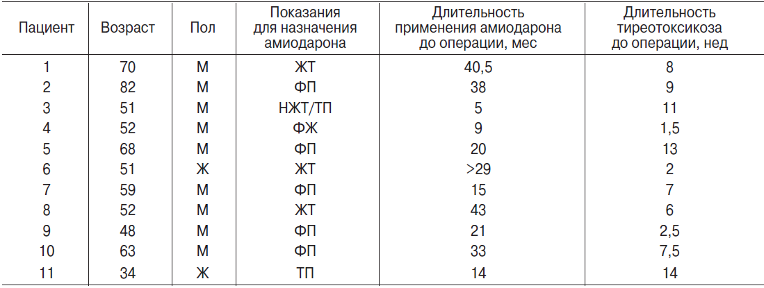 С января 1998 г. по ноябрь 2015 г. 11 пациентов подверглись тотальной тиреоидэктомии под общим наркозом с целью лечения АмИТ. Основные характеристики пациентов представлены в таблицах ниже. Табл. 1 иллюстрирует демографические показатели и особенности применения амиодарона.