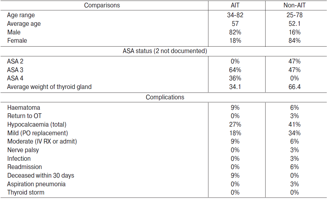 Методы. Мы проводили сравнение пациентов, подвергшихся хирургическому лечению АмИТ, и пациентов, перенесших тотальную тиреоидэктомию по другим показаниям. Нами были проанализированы демографические данные пациентов, сведения об их ASA-статусах, весе щитовидной железы, осложнениях (возникших в результате хирургического лечения и наркоза) и частоте тиреотоксического криза.