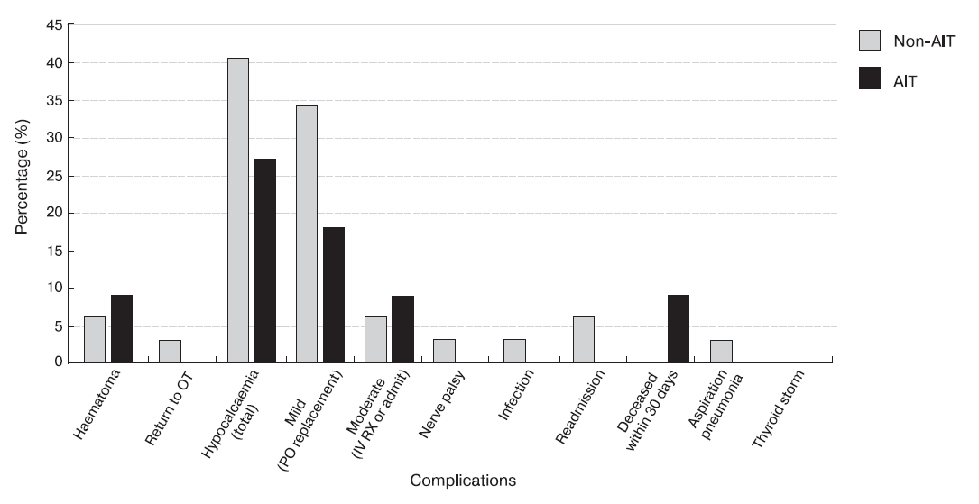 В табл. 2 приведено сравнение демографических данных, ASA-статусов, веса щитовидной железы и осложнений, возникающих в результате хирургического лечения у пациентов с АмИТ и без. Значения представлены в процентах, чтобы облегчить сравнение не равных по размеру групп. Рис. 2 содержит графическое представление частоты различных осложнений в двух группах.
