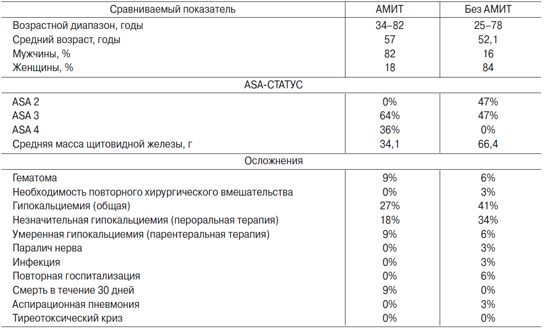 Выводы. Тотальная тиреоидэктомия является безопасной процедурой и может выполняться у пациентов с АмИТ.