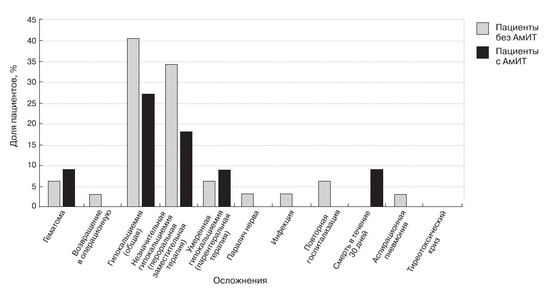 В целом больше осложнений возникало у пациентов без АмИТ. Однако это может быть обусловлено большим размером щитовидной железы.