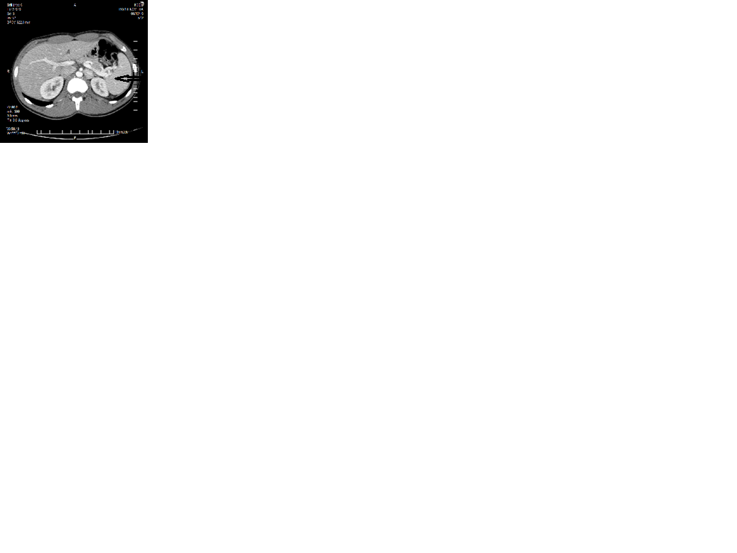 Рис. 9. Девочка Ш., 16 лет. Инсулинома хвоста ПЖ размерами 12 × 10 мм (стрелка).