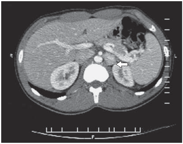 21. Рис. 9. Девочка Ш., 16 лет. Инсулинома хвоста ПЖ размерами 12 × 10 мм (стрелка). | |