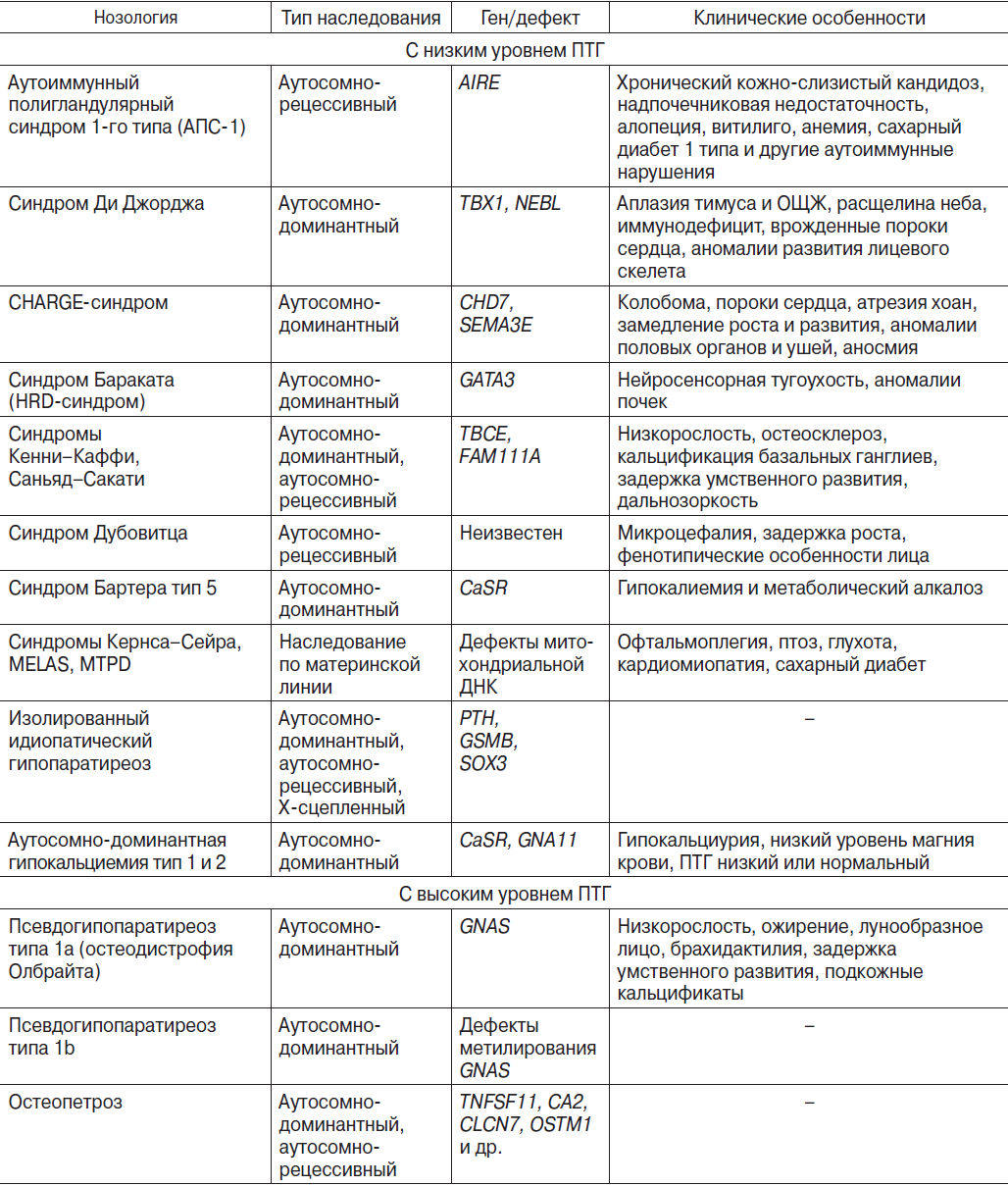 В детском или подростковом возрасте основной причиной гипопаратиреоза является одно из наследственных заболеваний, приводящих к нарушению эмбриогенеза или аутоиммунному поражению ОЩЖ, а также дефектам рецепторов к ПТГ (табл. 1). Установление конкретной нозологической формы гипопаратиреоза позволяет прогнозировать тяжесть заболевания, вероятность развития патологии других органов и выработать тактику лечения пациентов [17].