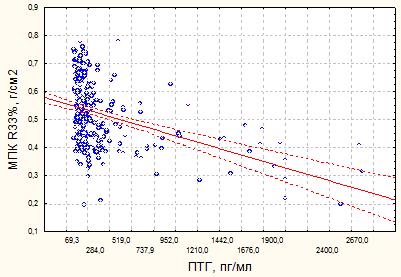 2. Корреляция между уровнем паратгормона и минеральной плотностью костной ткани в дистальной трети лучевой кости (n = 358). | |