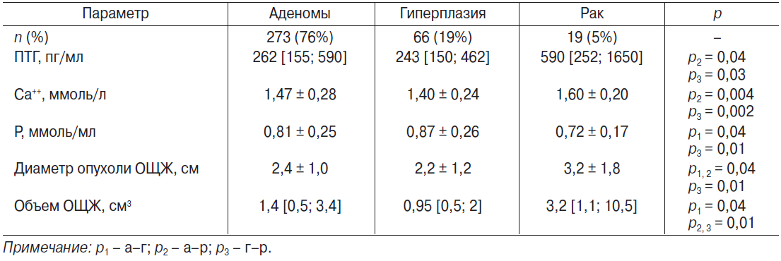 Results. The group of patients with PG carcinoma showed the increased level of Ca++ of more than 1.60 mmol/l (p = 0.004) and increased level of PTH of more than 600 pg/ml (p = 0.03). The size of tumors of more than 6 cm3 is more typical to malignant neoplasm compared to the adenoma of the PG (p = 0.01).