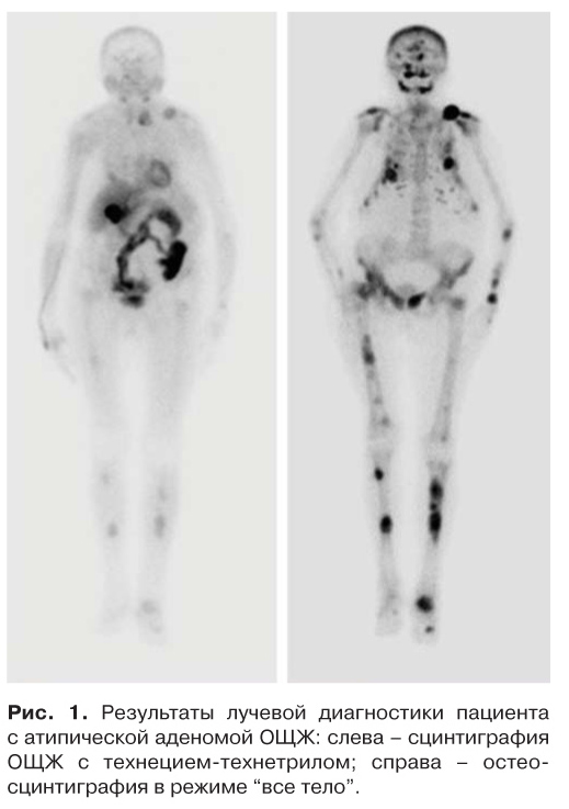 1. Рис. 1. Результаты лучевой диагностики пациента с атипической аденомой ОЩЖ: слева – сцинтиграфия ОЩЖ с технецием-технетрилом; справа – остеосцинтиграфия в режиме “все тело”. | |