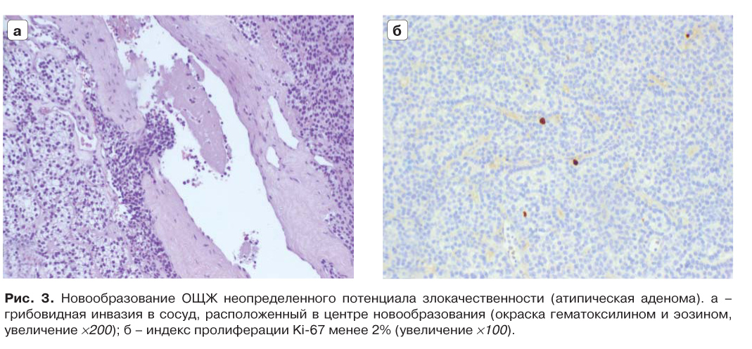 3. Рис. 3. Новообразование ОЩЖ неопределенного потенциала злокачественности (атипическая аденома). а – грибовидная инвазия в сосуд, расположенный в центре новообразования (окраска гематоксилином и эозином, увеличение ×200); б – индекс пролиферации Ki-67 менее 2% (увеличение ×100). | |