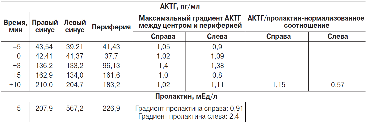 5. Таблица 2. Результаты селективного забора крови из нижних каменистых синусов пациента Б. | |