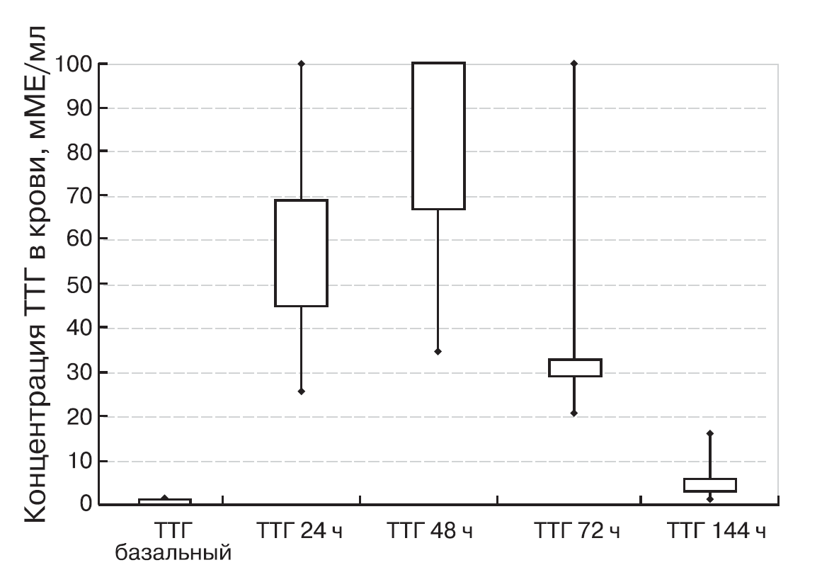 У всех пациентов исходно был определен уровень содержания ТТГ и ТГ в сыворотке крови. Исходно (перед введением тиротропина-альфа) секреция ТТГ была супрессирована у всех включенных в исследование пациентов. Содержание ТТГ превысило порог минимально необходимого уровня ТТГ (30 мМЕ/мл) через 24 ч после первой инъекции рч-ТТГ у 86% пациентов, через 48 ч – у всех (100%) пациентов, причем у 66 пациентов (75,1%) уровень ТТГ превышал 100 мМЕ/мл (рис. 1).