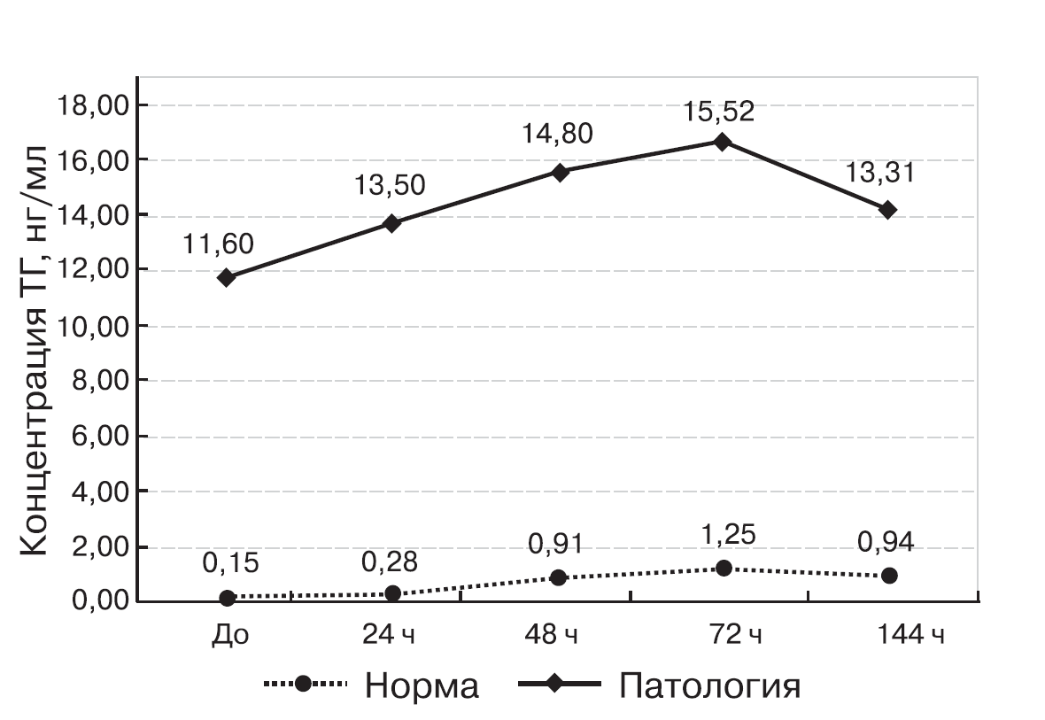 Рис. 3. Динамика уровня ТГ при проведении радиойодаблации на фоне теста с введением тиротропина-альфа при рецидиве (патология) опухоли и в его отсутствие (норма).