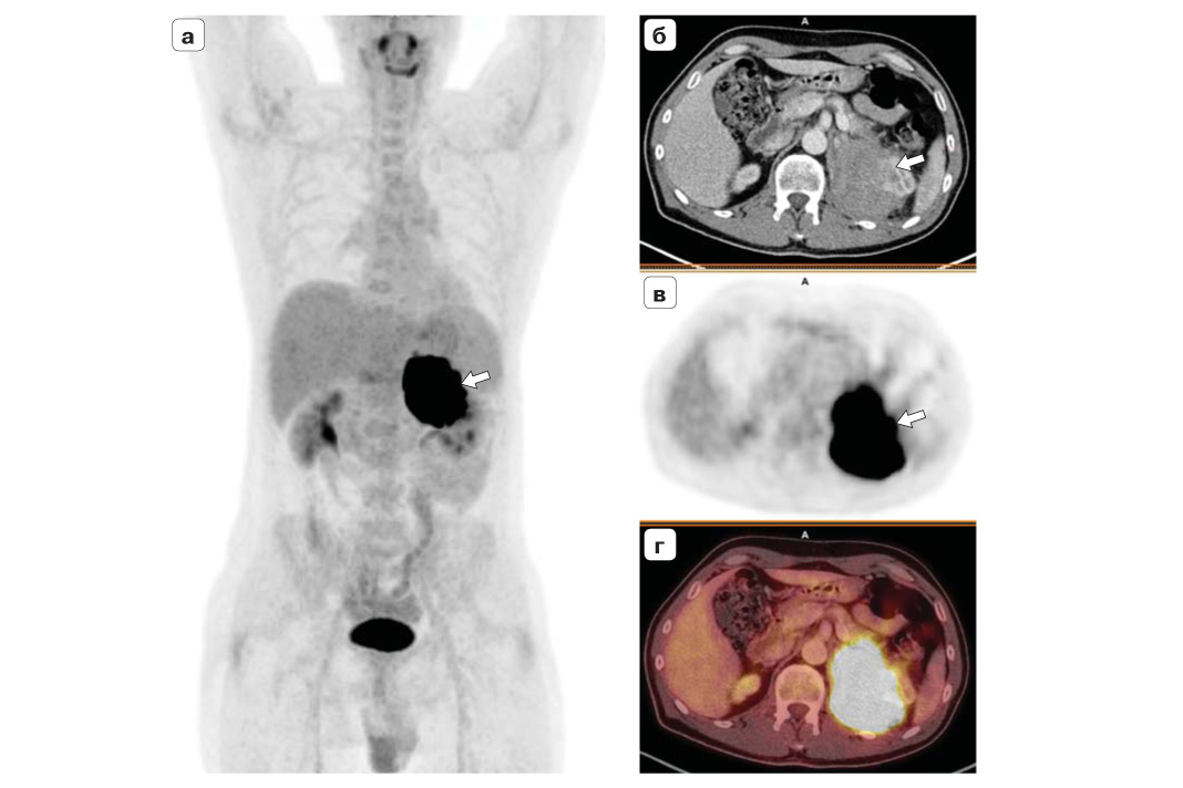 Рис. 1. Рецидив адренокортикального рака после адреналэктомии. ПЭТ/КТ-исследование с 18F-ФДГ. ПЭТ (MIP) во фронтальной проекции (а), КТ с внутривенным контрастным усилением (б), ПЭТ- (в) и ПЭТ/КТ- (г) изображения в аксиальной проекции. Стрелками отмечено объемное образование в ложе левого надпочечника с признаками выраженного накопления РФП (SUVmax 33,27).