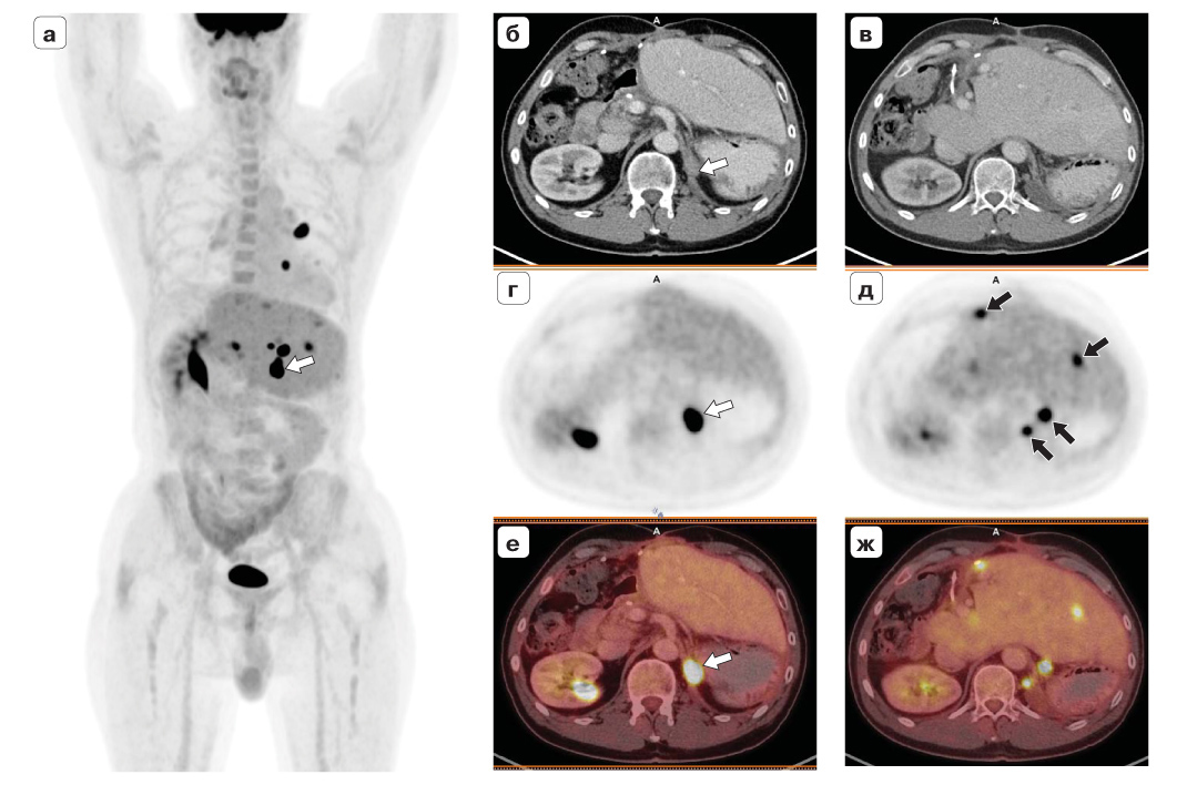 Рис. 2. Прогрессирование адренокортикального рака с метастатическим поражением печени, легких и внутри грудных лимфоузлов. Состояние после гемигепатэктомии. ПЭТ/КТ-исследование с 18F-ФДГ. ПЭТ (MIP) во фронтальной проекции (а), КТ с внутривенным контрастным усилением (б, в), ПЭТ (г, д) и ПЭТ/КТ (е, ж) в аксиальной проекции. Объемное образование в ложе левого надпочечника (белые стрелки), метастазы (черные стрелки).