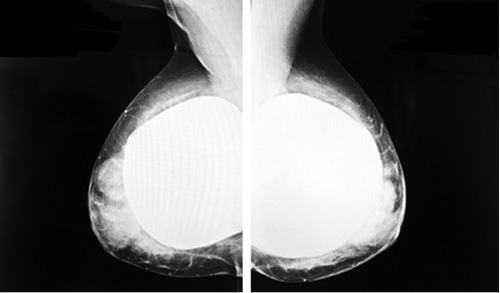 1. Fig. 1. Mammography of 2017 after subtotal reduction plastic surgery with prosthetics. | |