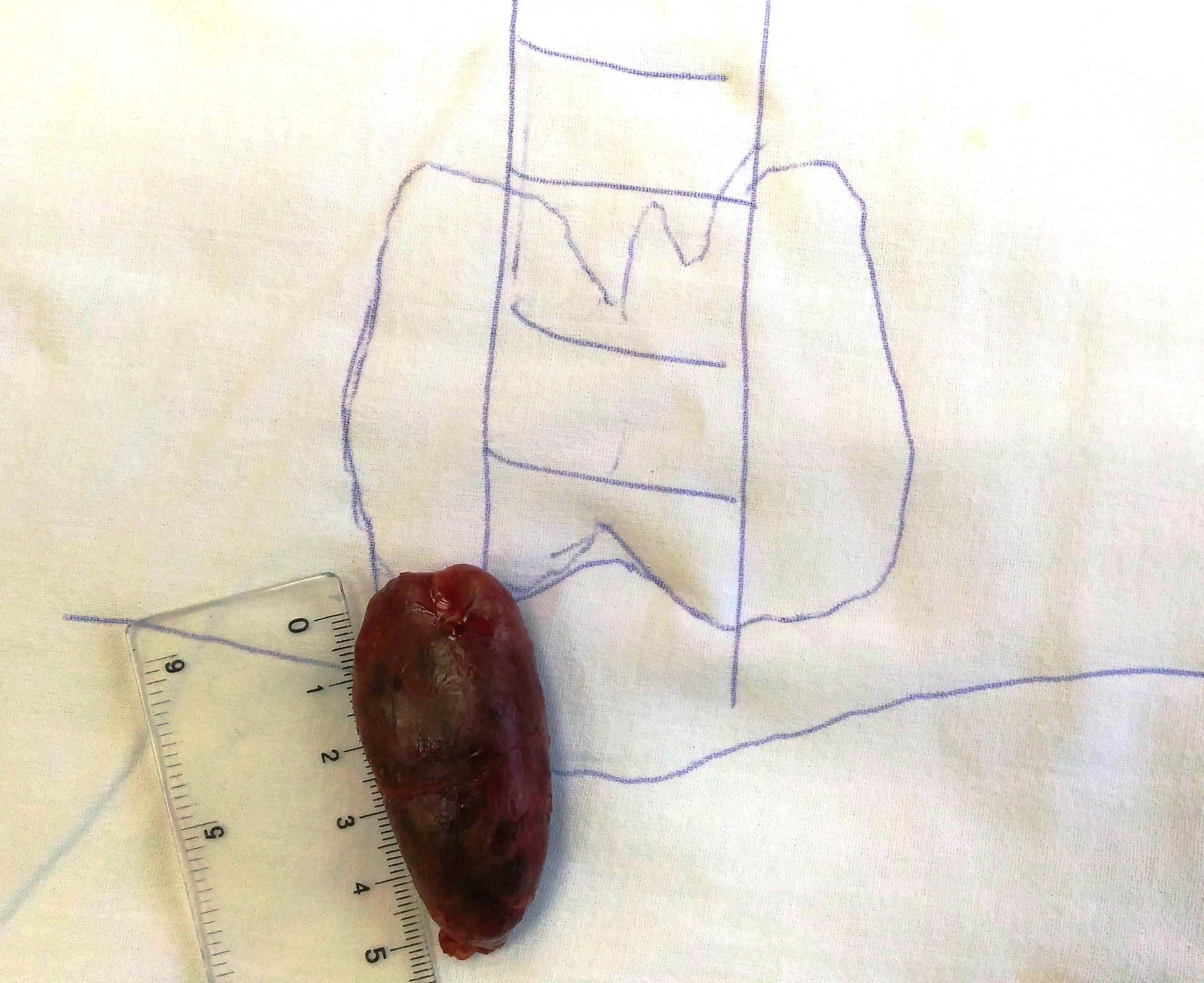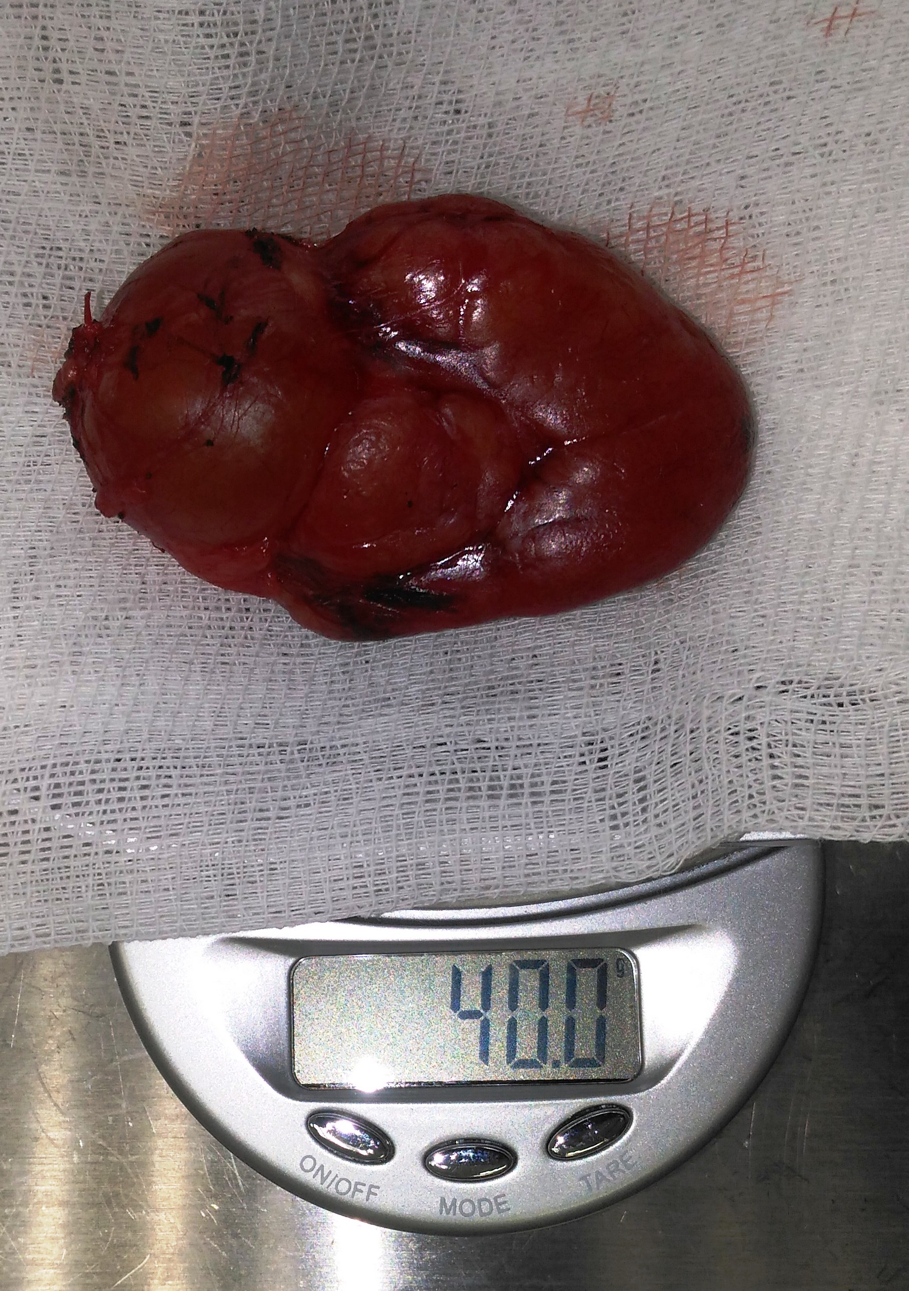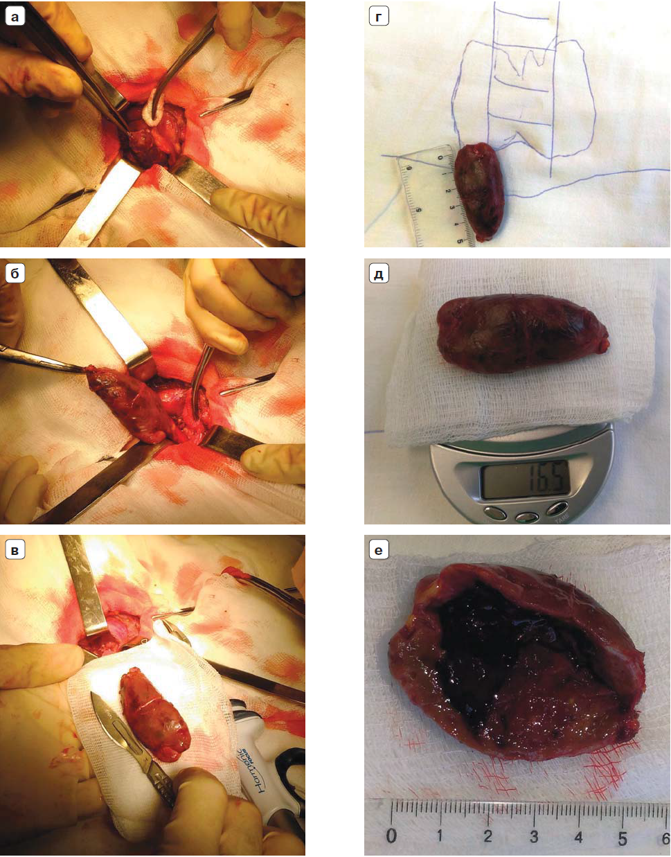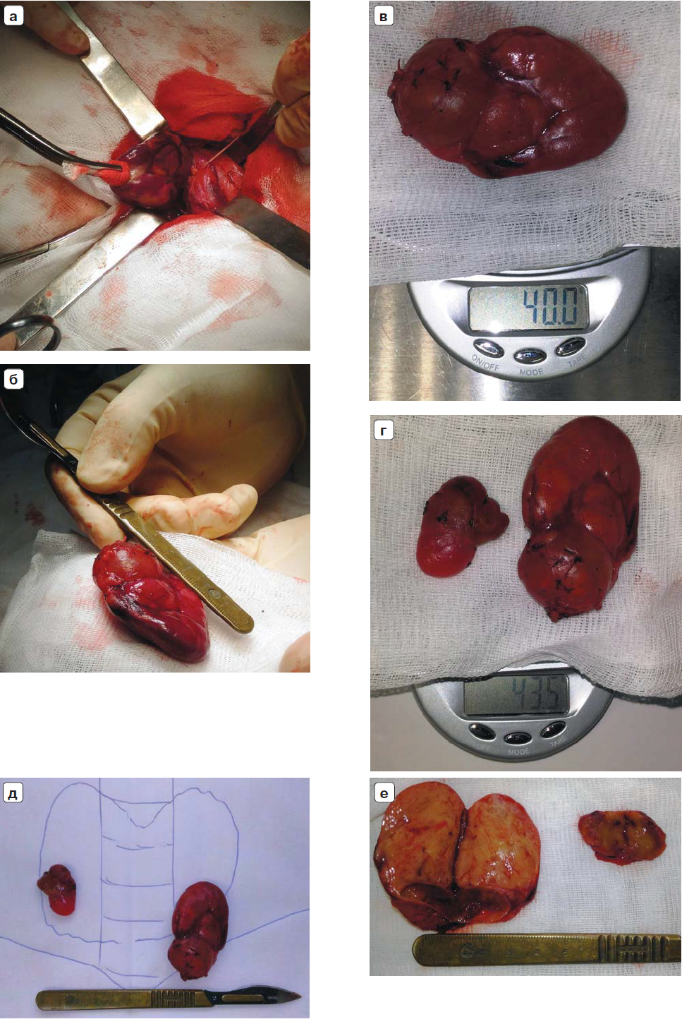 14. Рис. 2. Аденомы околощитовидных желез: а – выделение гигантской аденомы ОЩЖ слева; б – определение размеров аденомы ОЩЖ слева после ее удаления; в – взвешивание гигантской аденомы ОЩЖ на электронных весах; г – взвешивание удаленных аденом ОЩЖ; д – схема топического расположения удаленных аденом ОЩЖ; е – макроскопический вид удаленных аденом ОЩЖ на разрезе. | |