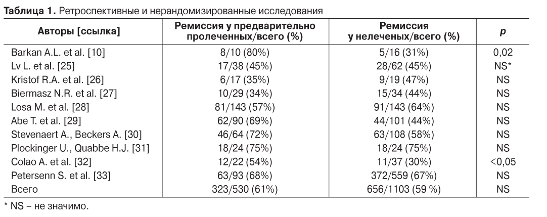 Thus, in retrospective non-randomized studies there was no difference in the surgical control rate between SRL- pretreated and untreated patients. Only two studies reported statistically significant improvement in the surgical control rate [10, 32], but the baseline (SRL untreated) control rate was markedly lower than in the rest of the studies. Stevenaert [30] reported no overall difference between SRL-treated and untreated groups, but found higher remission rates in SRL-pretreated enclosed adenomas, including microadenomas, a finding that is difficult to explain.